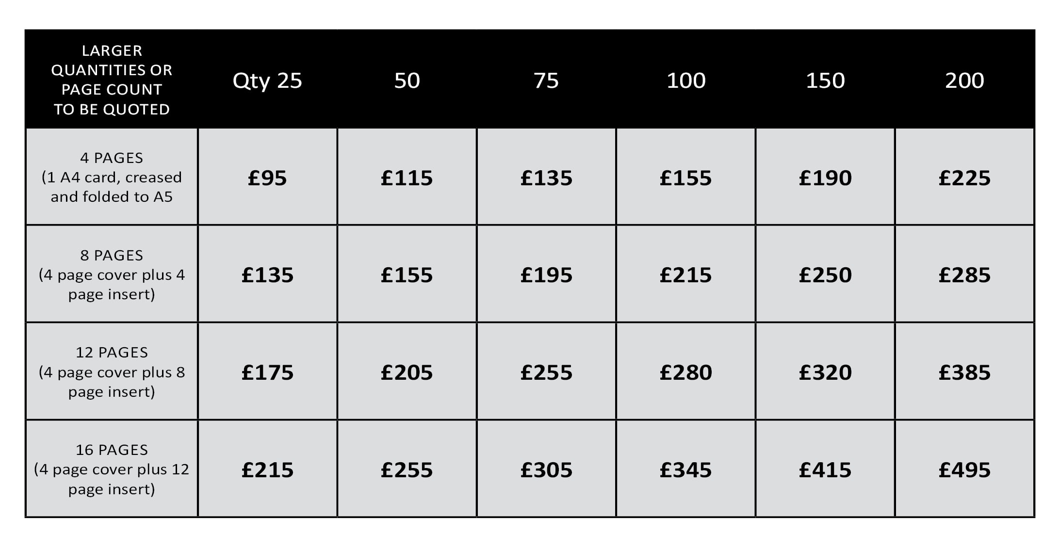 Prices quoted include collating, creasing, folding and booklet stapling (if required) and a final trim for a professional finish. We will email you a PDF proof to check before proceeding to print.